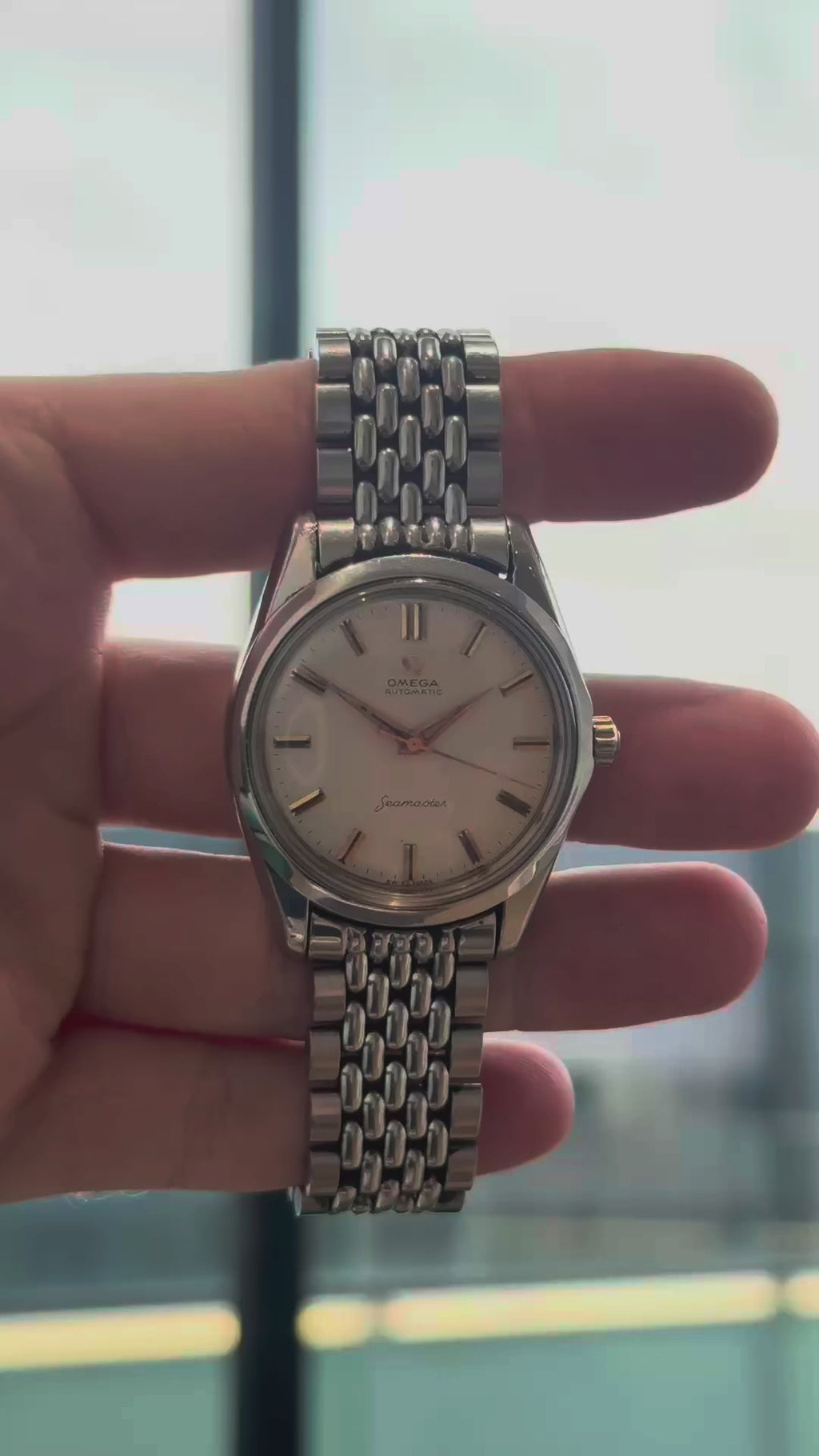 This Seamaster boasts a sporty, polished finish. A polished bezel surrounds a silver dial with rose gold hands and stick indices protected by an acrylic with no scratches or wear. On the case back, you'll find a Sea Horse Seamaster emblem.