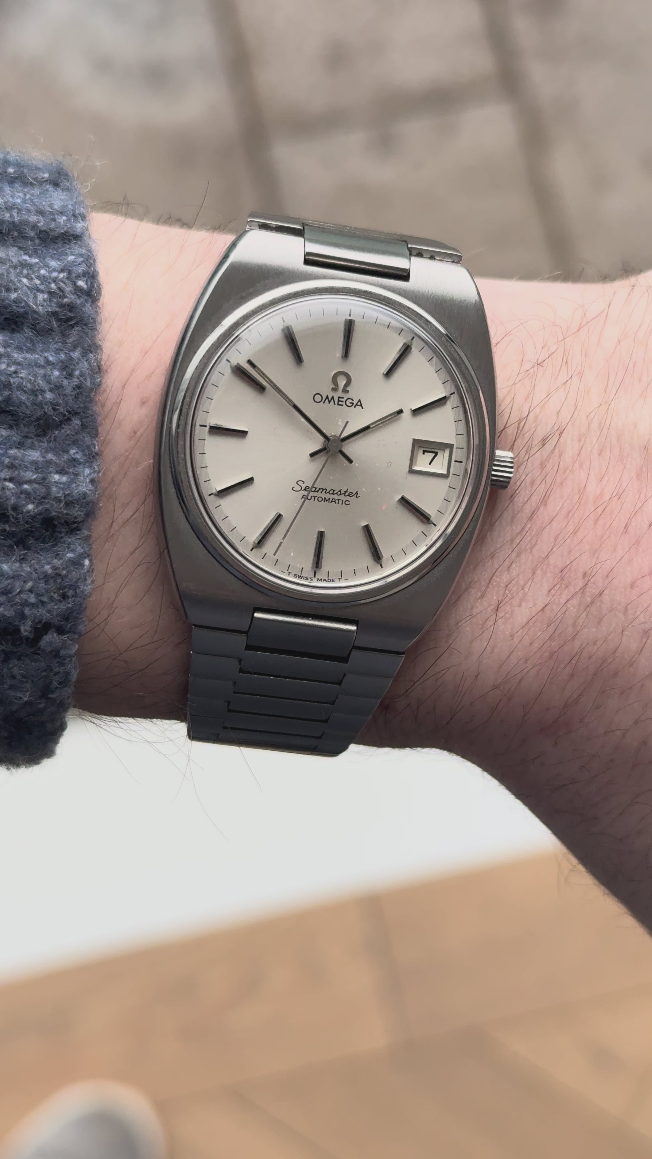 The 34mm stainless steel polished and satin-finished case surrounds a silver, sunburst dial. The dial features silver stick indices, silver hands, and a date window at the 3 o'clock position. The vintage Seamaster is complete with a plexiglass.